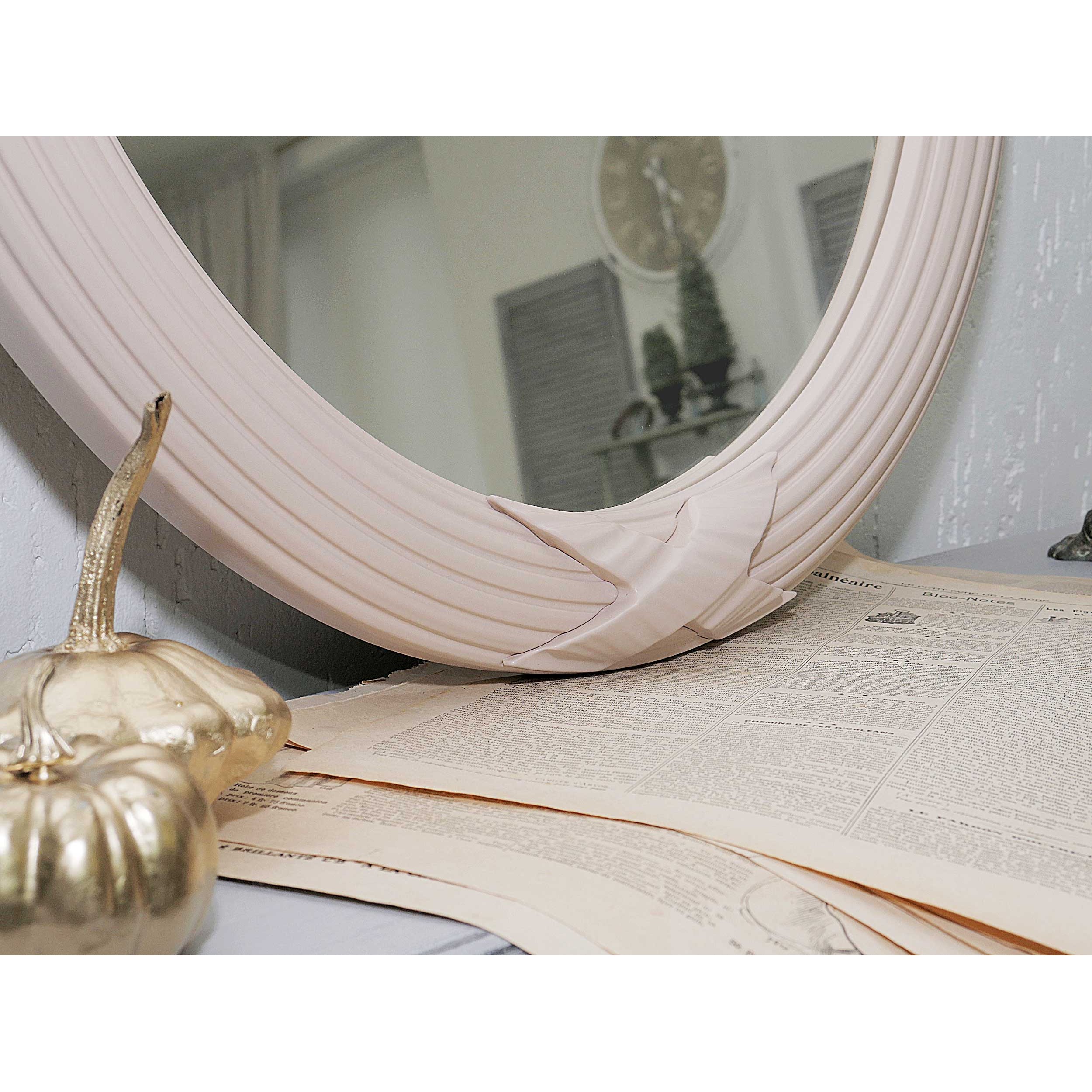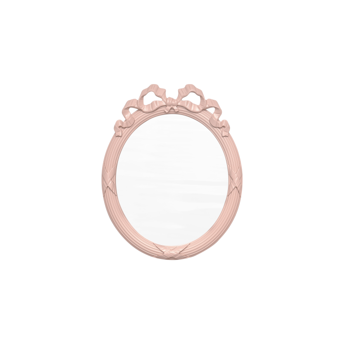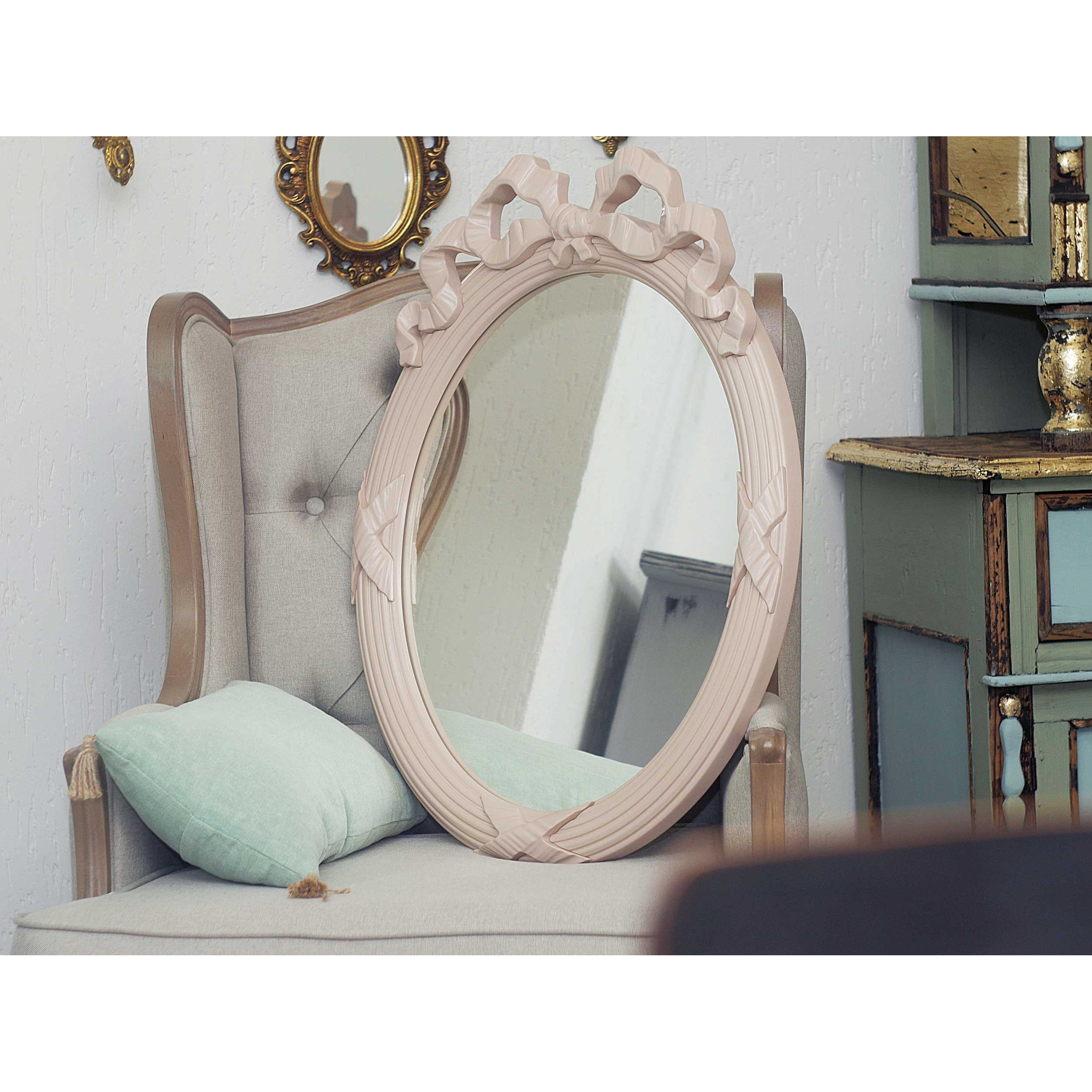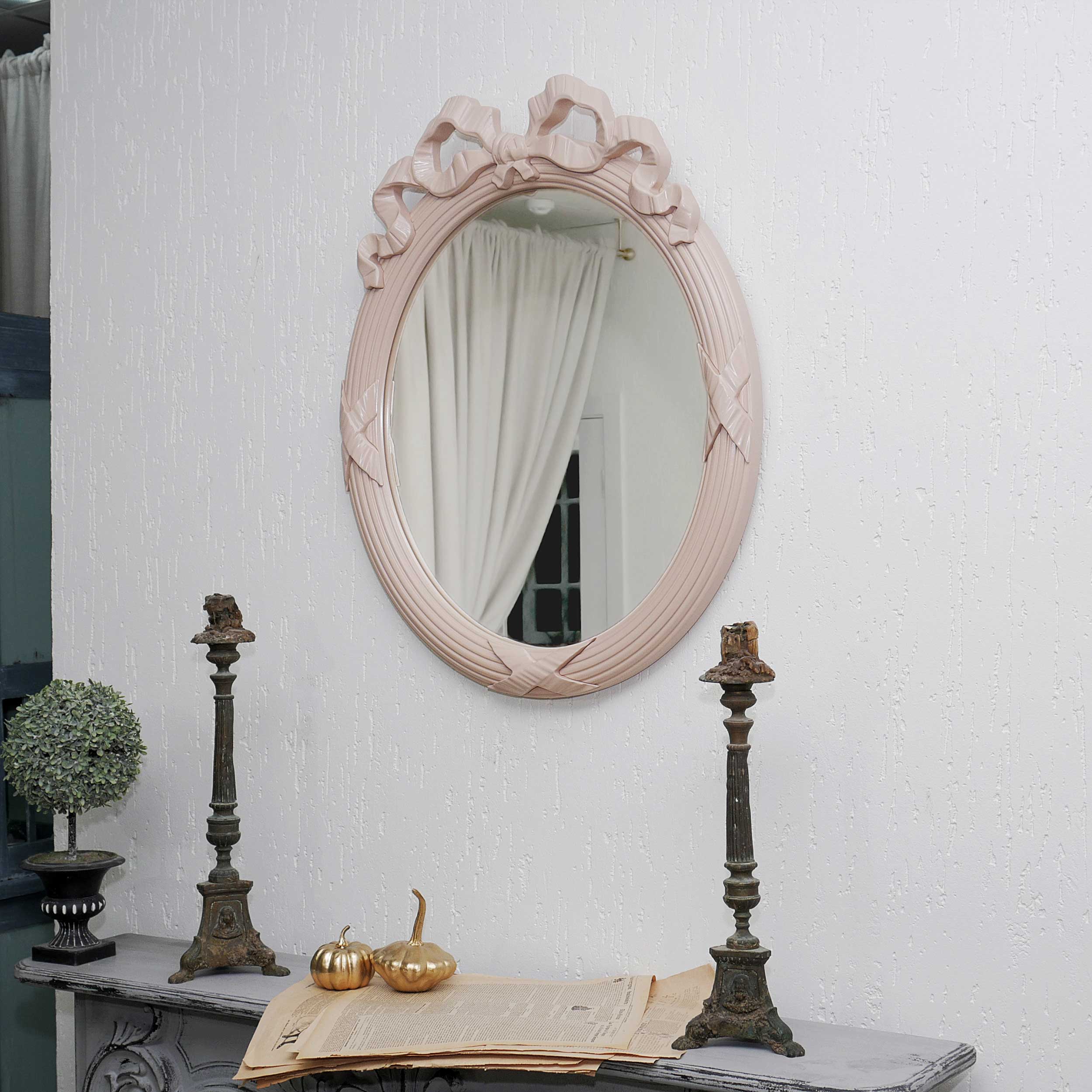Классическое зеркало овальной формы. Декор в виде вьющихся лент на раме прошел испытание временем и прочно закрепился в дизайне классических зеркал.