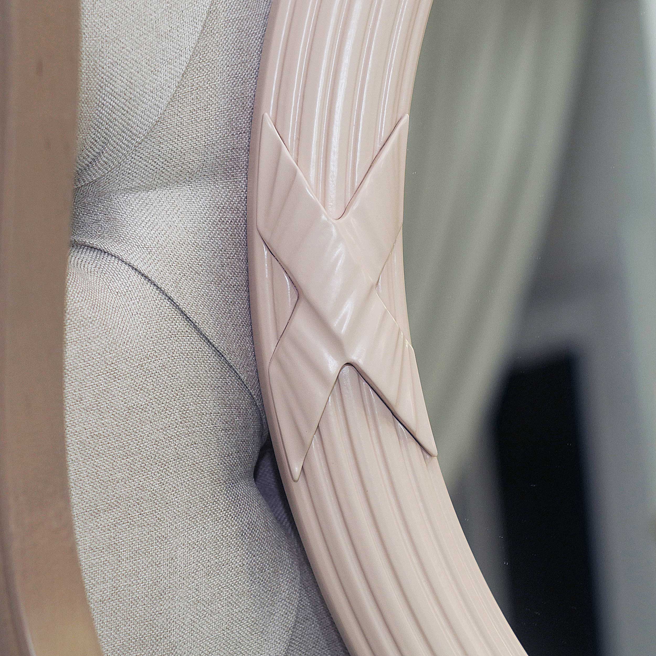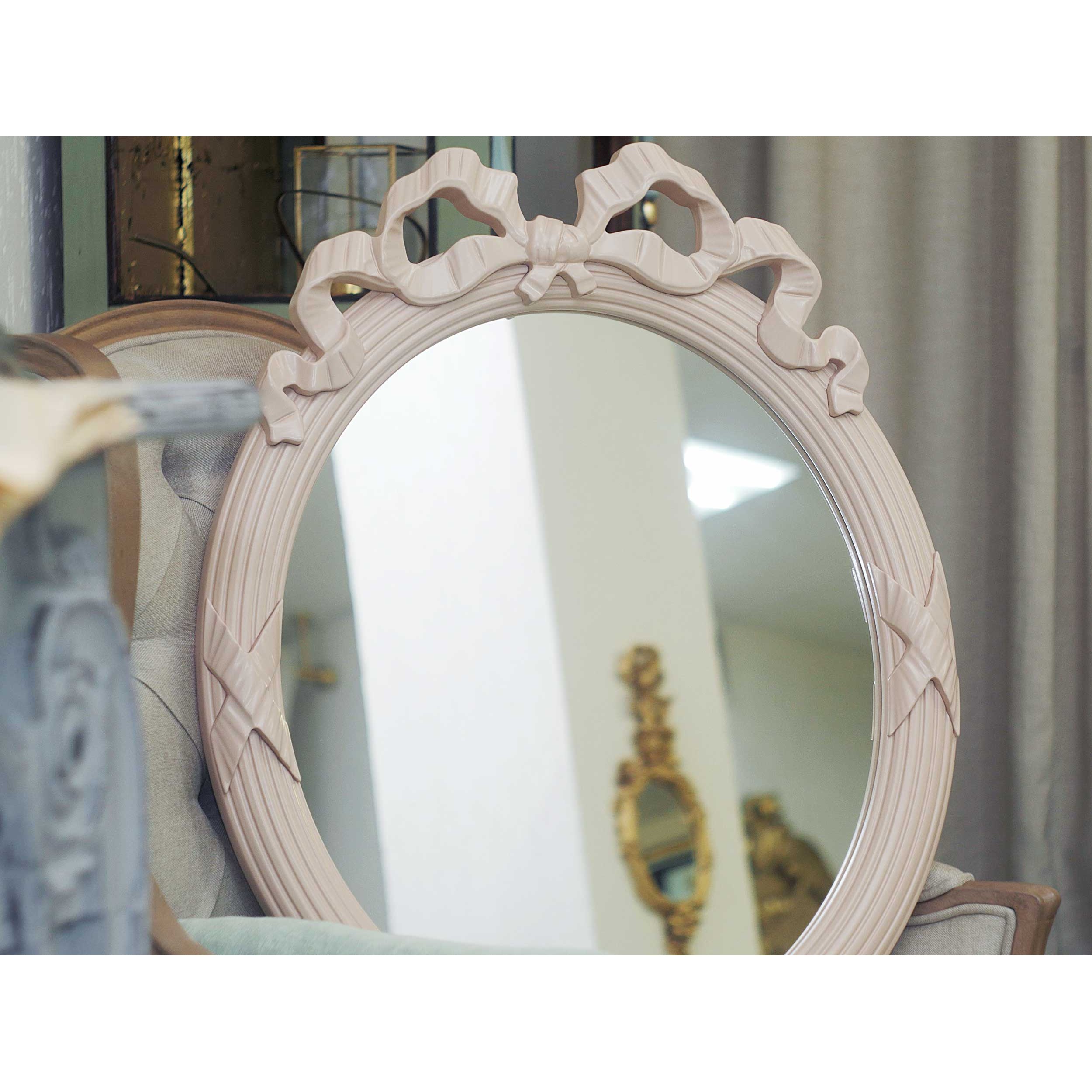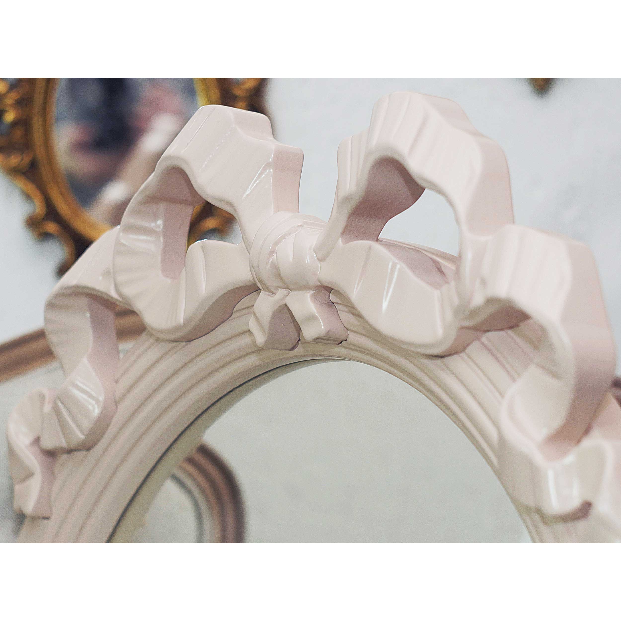 Классическое зеркало овальной формы. Декор в виде вьющихся лент на раме прошел испытание временем и прочно закрепился в дизайне классических зеркал.